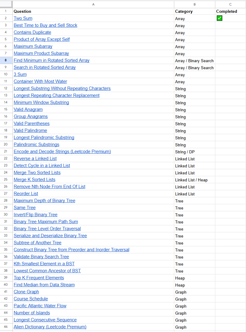 I’ve also created a template tracker you can clone to keep track of your progress. You can hide the category column if you want to approach these problems in a random order, or tackle section by section to improve in a specific topic.