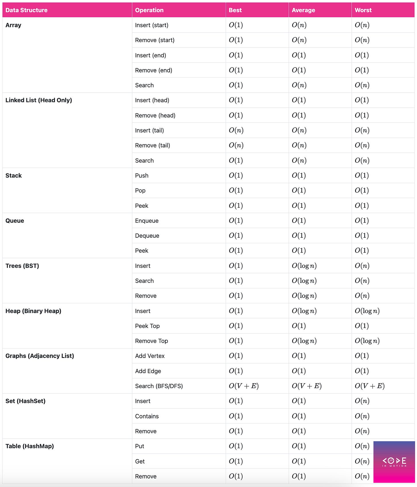 You don’t need to know how to implement every data structure from scratch; however, you need to know the time complexities associated with their operations. Note that the best case time complexities are not that interesting and are provided for completeness. The more interesting time complexities are the average and worst case ones.