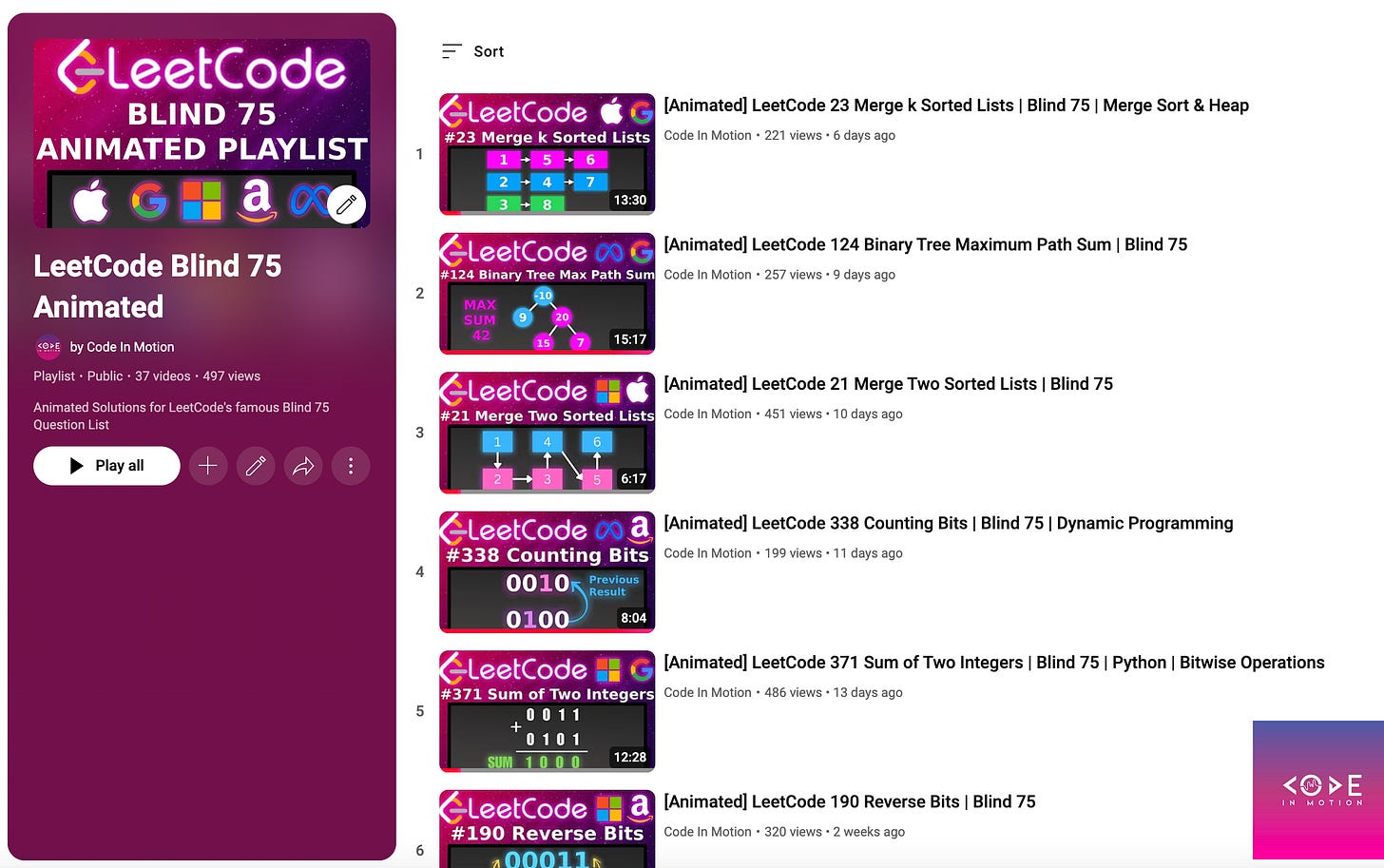 You will now be solving the remainder of the Blind 75 problem set. I have extremely high quality, animated solutions for the Blind 75 set on my YouTube channel for FREE, so be sure to check them out to help you study!